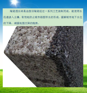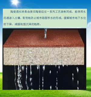 陶瓷透水磚是磚體透水,吸水,快速透水功能,可以防止地下水枯竭,減輕下水道的負(fù)擔(dān)。防止城市內(nèi)澇,降低周邊環(huán)境溫度,改變熱島效應(yīng)。另外,由于強(qiáng)大的透水功能,即使下雨走路也不濕鞋,不濺起。